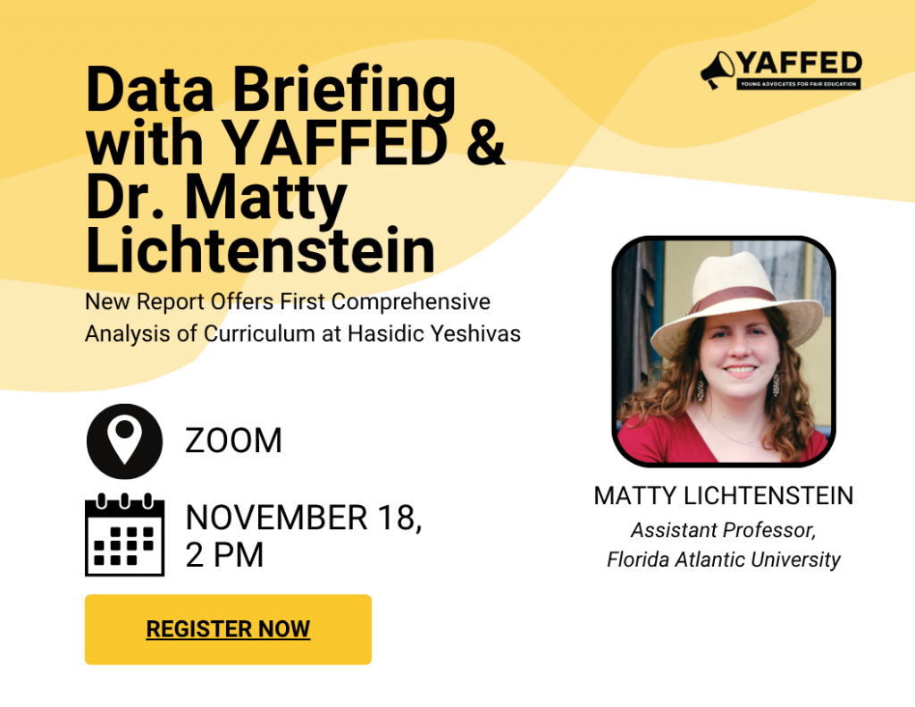 On November 12, 2025 YAFFED announced the release of Jewish Education in New York State, a groundbreaking study authored by Dr. Matty Lichtenstein, a scholar of Jewish education and policy. The report represents the most comprehensive analysis to date of what students in Hasidic and other Jewish schools are being taught — and what the State of New York has failed to assess. The results reveal striking disparities in core instruction, particularly in Hasidic boys’ schools.